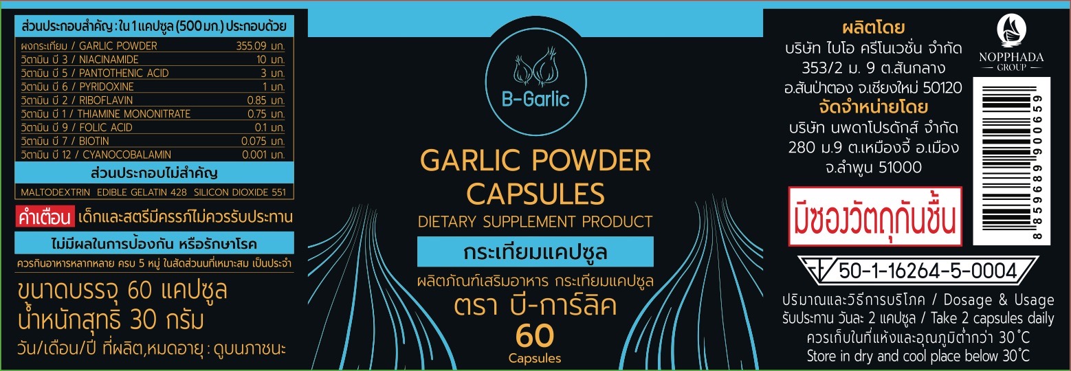 5. ผลิตภัณฑ์เสริมอาหาร กระเทียมแคปซูล ตรา บี-การ์ลิก (อย. 50-1-16264-5-0004)