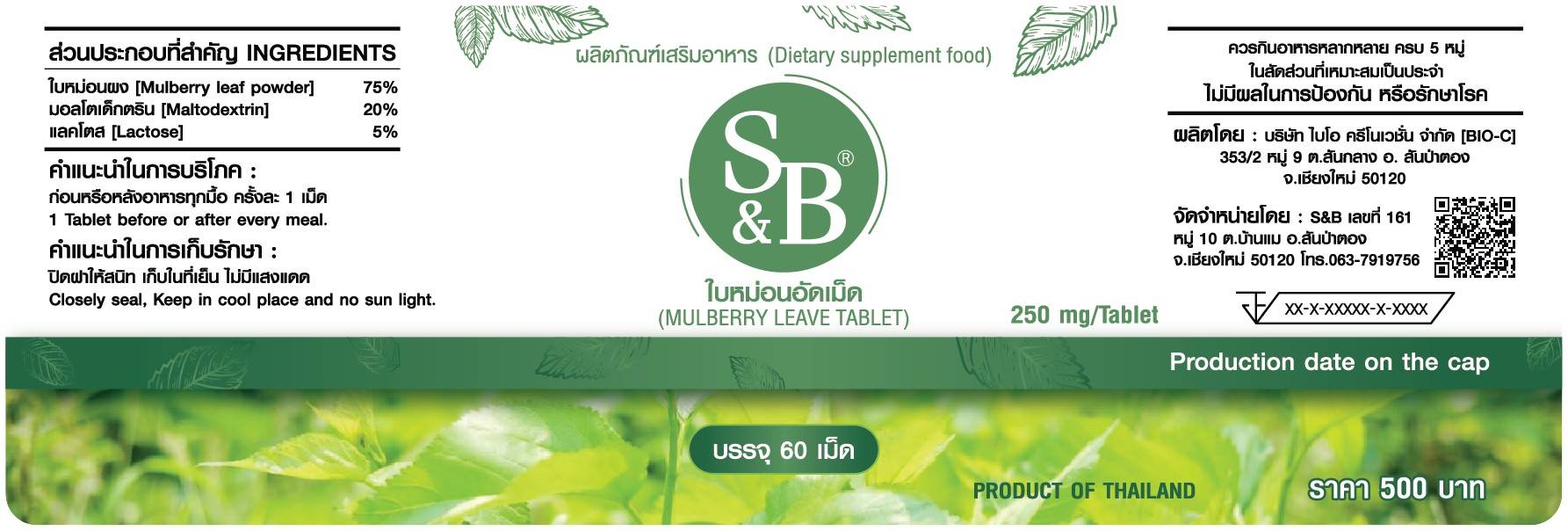 6. ผลิตภัณฑ์เสริมอาหาร ใบหม่อนอัดเม็ด ตรา เอส แอนด์ บี (อย. 50-1-16264-5-0005)